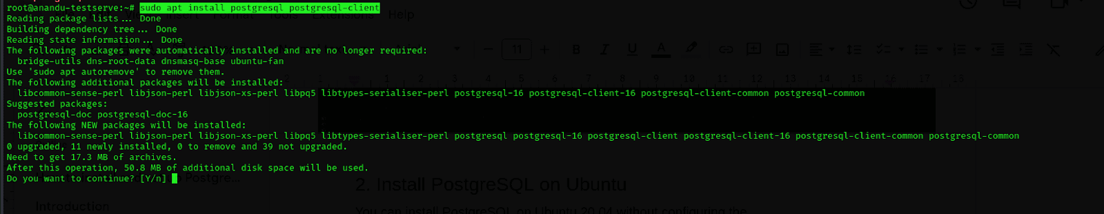 This command installs both the PostgreSQL server and the client. During installation, you may be prompted to confirm the installation by pressing ‘y’.